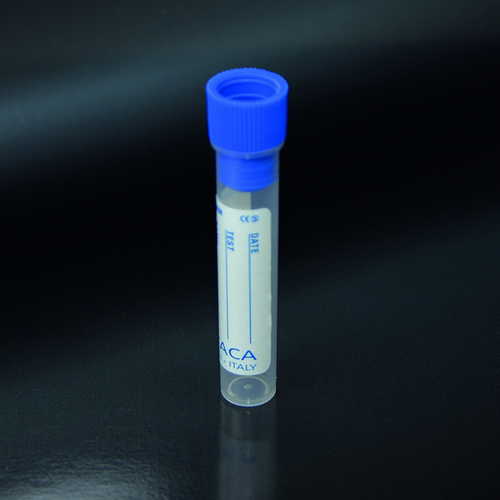 Tubos de ensayo de polipropileno, tapón a presión de color azul, aptos para análisis en química clínica e inmunología.