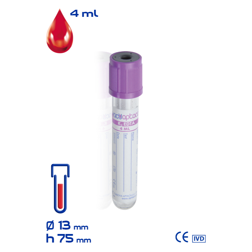 Tubo de ensayo al vacío VacuAptaca® Ø13×75 mm, en PET, con K2 EDTA, para 4 ml de sangre, tapón lavanda, estéril.
