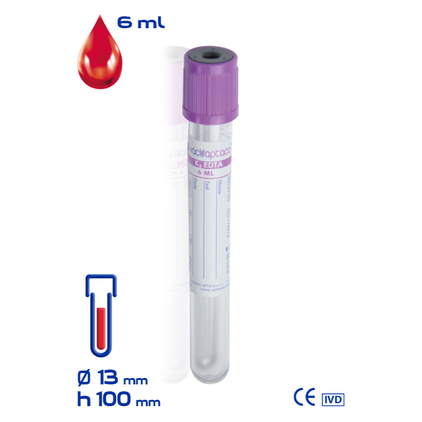 Tubo de ensayo al vacío VacuAptaca® Ø13×100 mm, en PET, con K2 EDTA, para 6 ml de sangre, tapón lavanda, estéril.