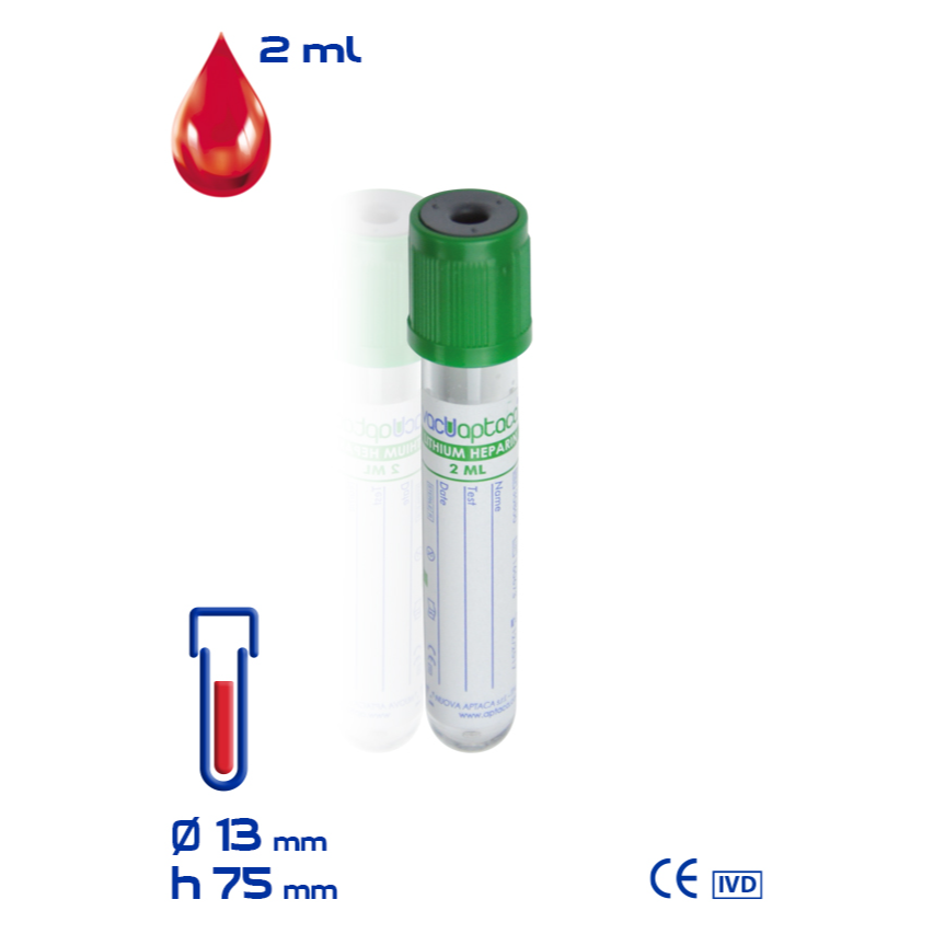 Tubo de ensayo al vacío VacuAptaca® Ø13×75 mm, en PET, con heparina de litio, para 2 ml de sangre, tapón verde, estéril.