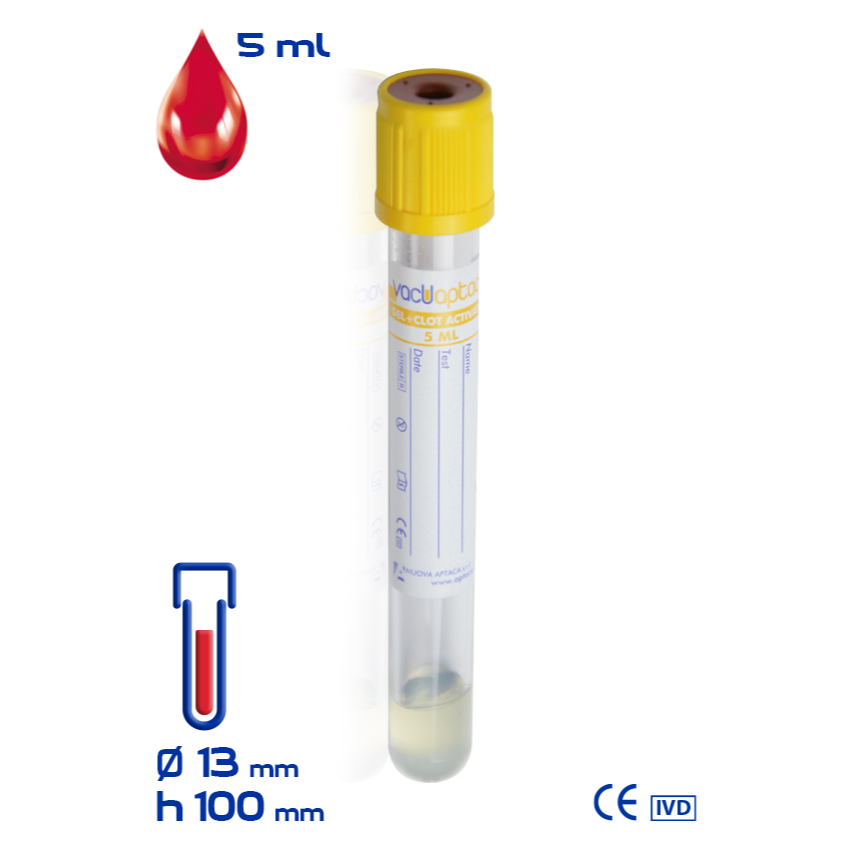 Tubo de ensayo al vacío VacuAptaca® Ø13×100 mm, en PET, con separador de gel + activador de coágulos, para 5 ml de sangre, tapón dorado y goma roja, estéril.
