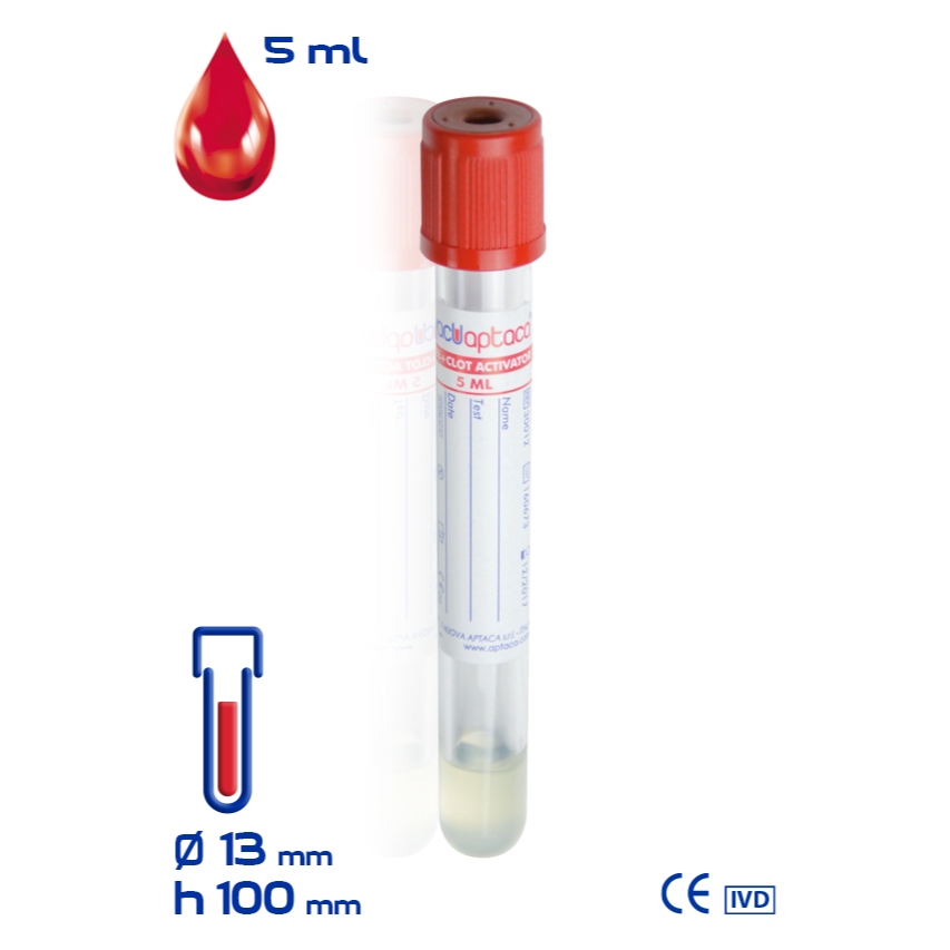 Tubo de ensayo al vacío VacuAptaca® Ø13×100 mm, en PET, con separador de gel + activador de coágulos, para 5 ml de sangre, tapón rojo y goma roja, estéril.