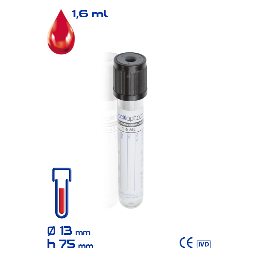 Tubo de ensayo al vacío VacuAptaca® Ø13×75 mm, en PET, con Citrato de Sodio 3,8%, para 1,6 ml de sangre, tapón negro, estéril.