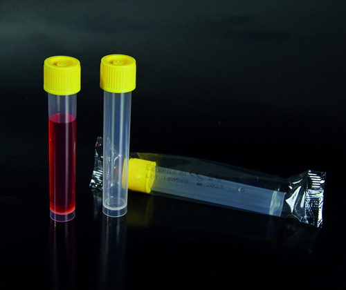 De polipropileno, sin graduación, con base de apoyo y tapón de rosca amarillo que garantiza un cierre hermético. Vol. 10 ml Ø 16 x 100 mm